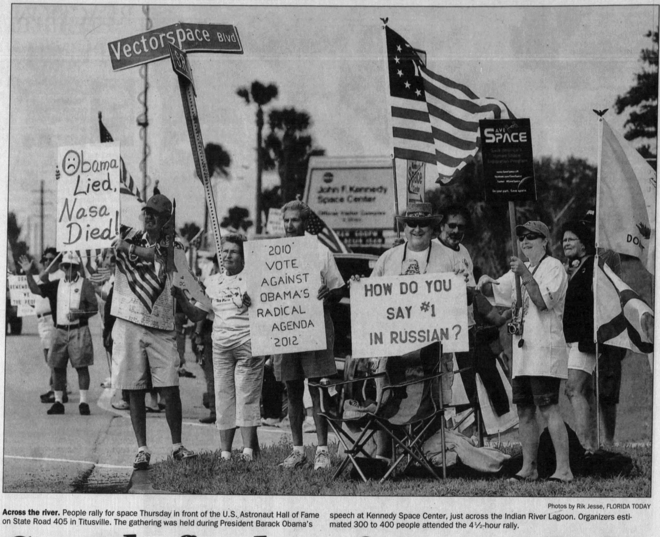 Protestors outside Kennedy Space Center on April 15, 2010, the day President Obama delivered his space policy speech. An Orlando TV station reported that some of the protestors said they were members of the far-right Tea Party. Image source: Florida Today.