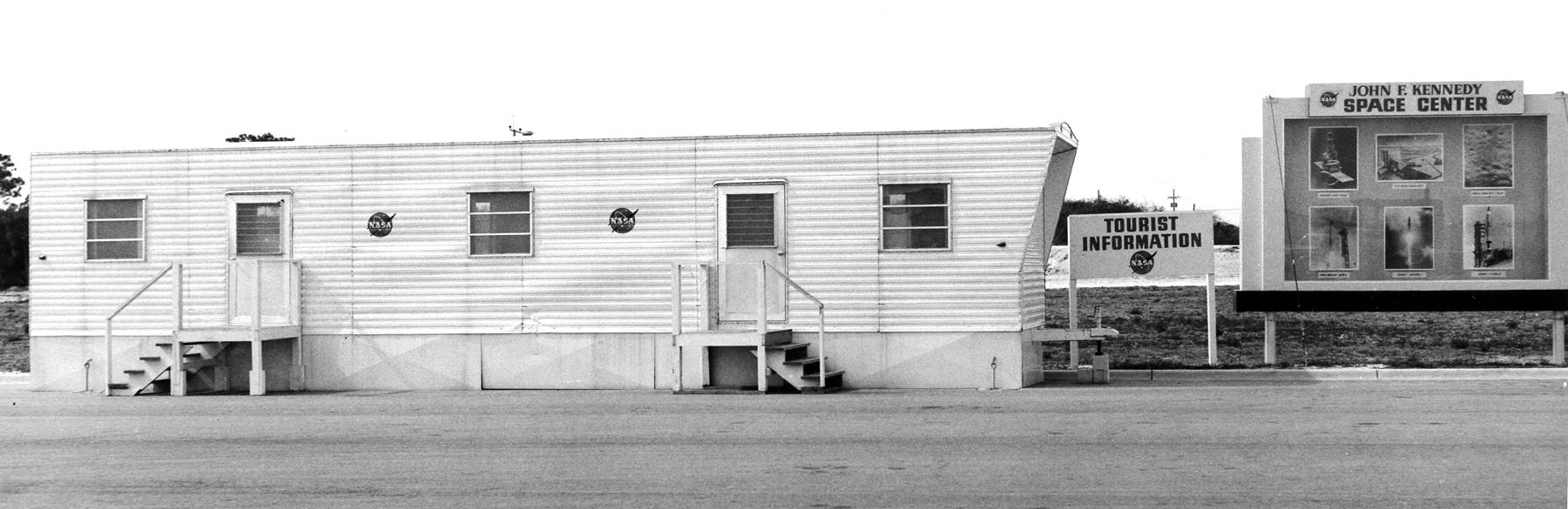 Kennedy Space Center opened to public tours in early 1965. The first visitor center was a trailer parked in a lot on the mainland side of NASA Causeway just west of the Indian River.